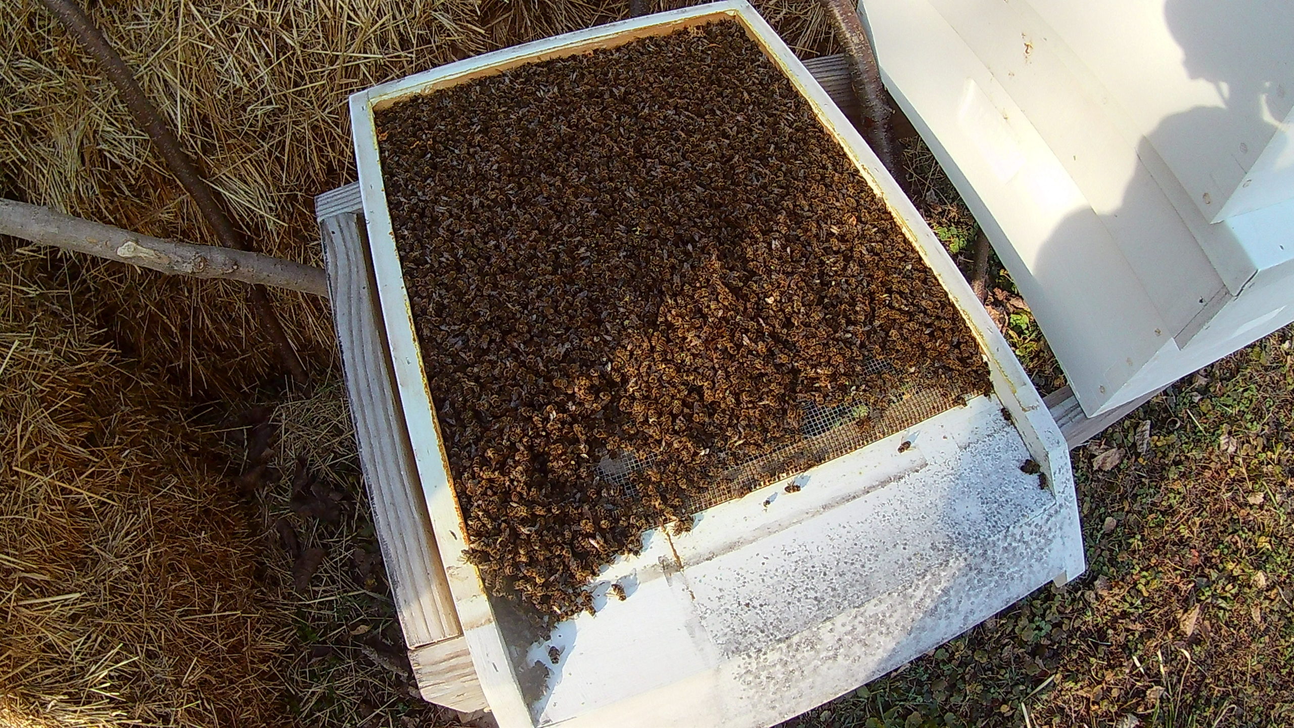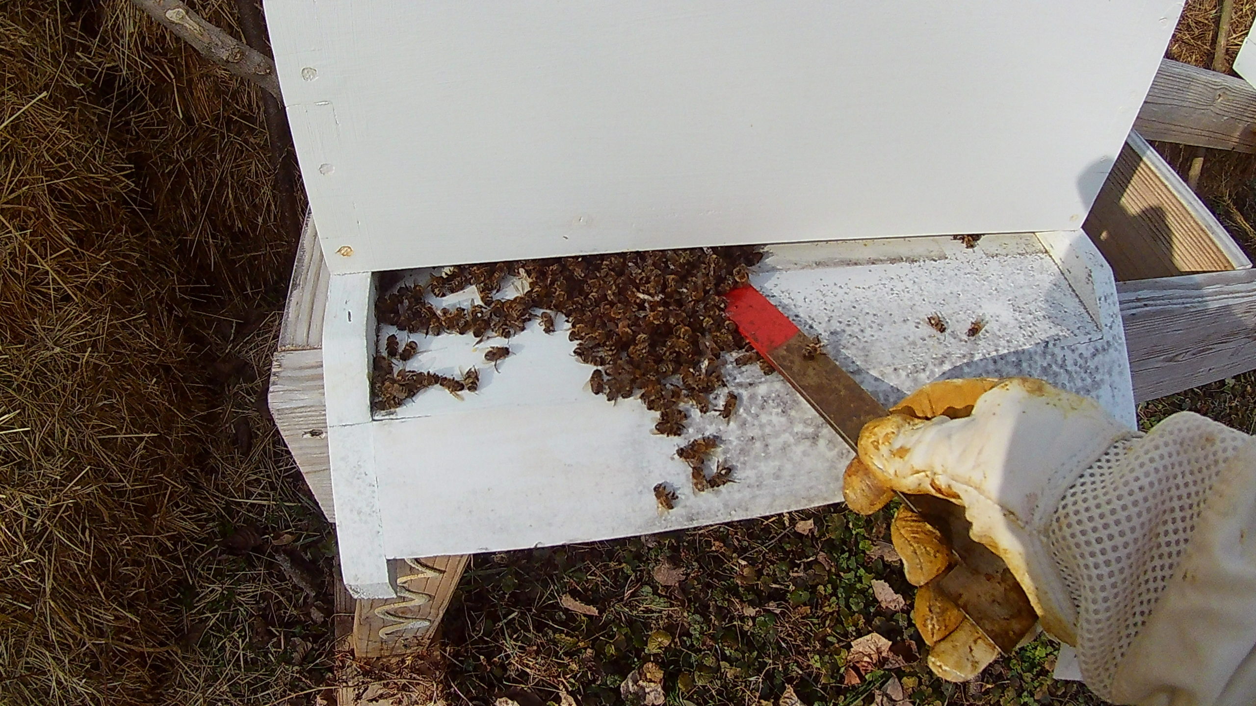The bottom board was just plastered with dead bees. The pile of bees has what looks like pieces of pollen all over too.