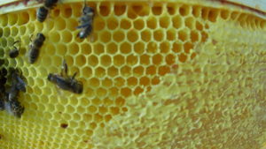 Capped honey on first medium box’s frame. I’m not sure but I believe the flaky light-colored stuff on the inside of the cells is Varroa mite fecal matter.