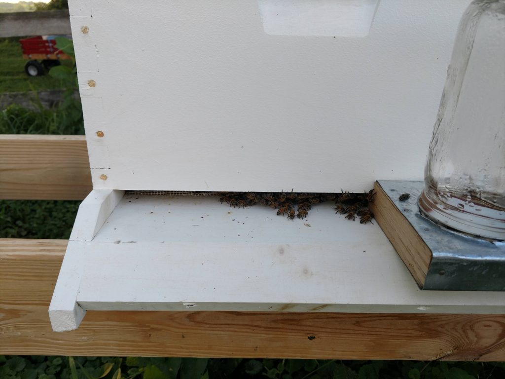 About 6pm. Bees in hive #2 very active. Fed 1qt 1:1 sugar water to each hive.