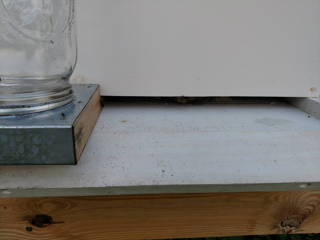 Around 8pm. 88 degrees. Just a little bit of sugar water left in each jar. Added from my storage bottle to fill both jars. The small hive I was able to do without my suit, but the larger hive was still pretty active outside the nest. Did not open the hives.