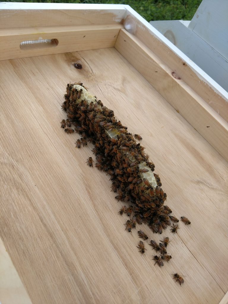 Hive #1 – Found queen alive and well. Five frames of brood, nectar and pollen in good patterns. New eggs laid. No new comb drawn on new frames. Some new comb on one side of one empty nuc frame. Brood in various stages.