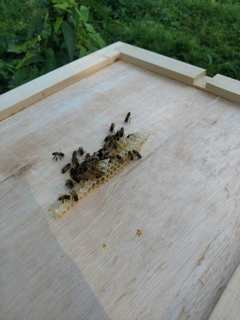 Hive #1 has visibly more bees and is generally more active. Frames 2-8 are now almost fully drawn. They have started putting nectar and pollen in the wax foundation frames.
