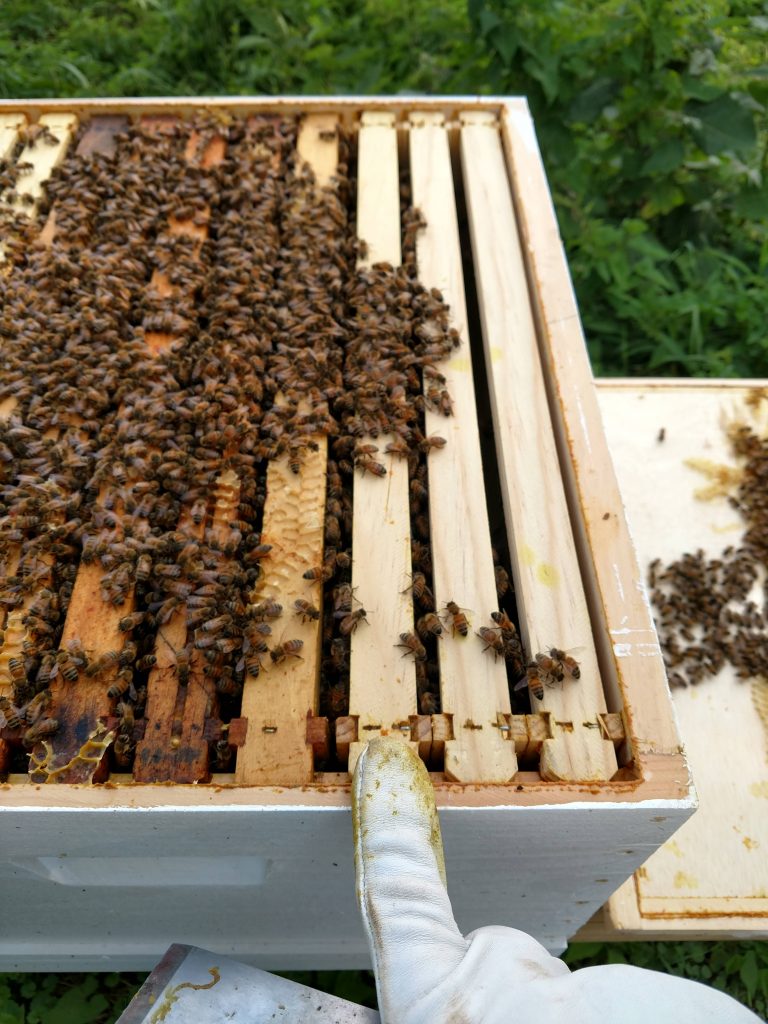 Hive 2 has definitely made progress. Definitely has more bees. Two more sides of drawn comb. Some pollen and nectar stores in the new comb from last week. More new eggs in the central frames. There are only three new (wax foundation) frames that don’t have anything on them. Bees on every frame, though. Stopped feeding sugar water.